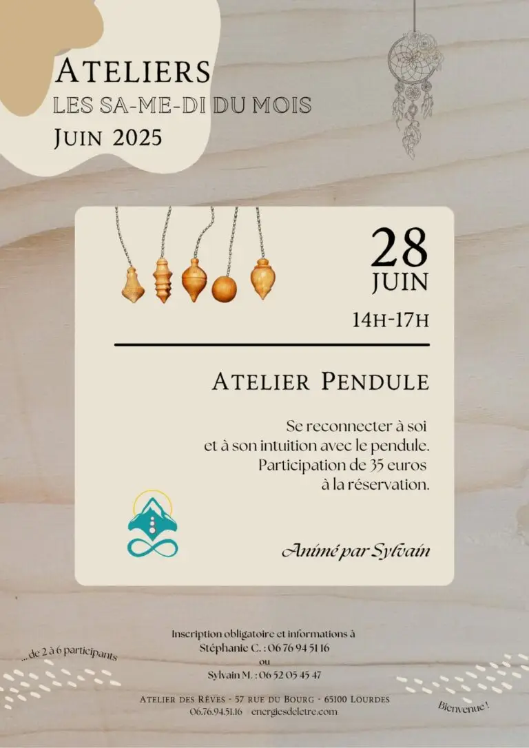 Accordez-vous un moment privilégié pour vous recentrer et écouter votre intuition. Au cours de cet atelier, vous découvrirez comment le pendule peut devenir votre allié. Après une relaxation guidée, vous apprendrez à utiliser cet outil pour vous poser les bonnes questions et obtenir des réponses claires. Une expérience unique pour développer votre intuition et vous sentir plus en harmonie avec vous-même.
