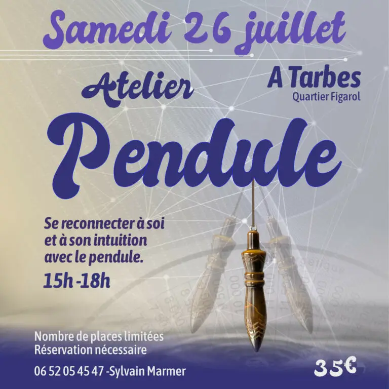 Accordez-vous un moment privilégié pour vous recentrer et écouter votre intuition. Au cours de cet atelier, vous découvrirez comment le pendule peut devenir votre allié. Après une relaxation guidée, vous apprendrez à utiliser cet outil pour vous poser les bonnes questions et obtenir des réponses claires. Une expérience unique pour développer votre intuition et vous sentir plus en harmonie avec vous-même.