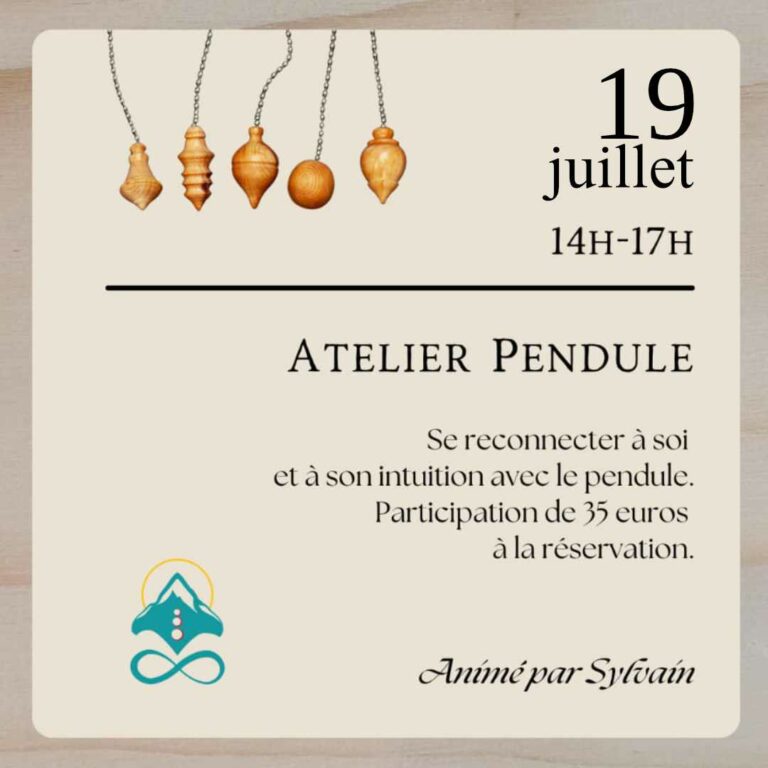 Accordez-vous un moment privilégié pour vous recentrer et écouter votre intuition. Au cours de cet atelier, vous découvrirez comment le pendule peut devenir votre allié. Après une relaxation guidée, vous apprendrez à utiliser cet outil pour vous poser les bonnes questions et obtenir des réponses claires. Une expérience unique pour développer votre intuition et vous sentir plus en harmonie avec vous-même.